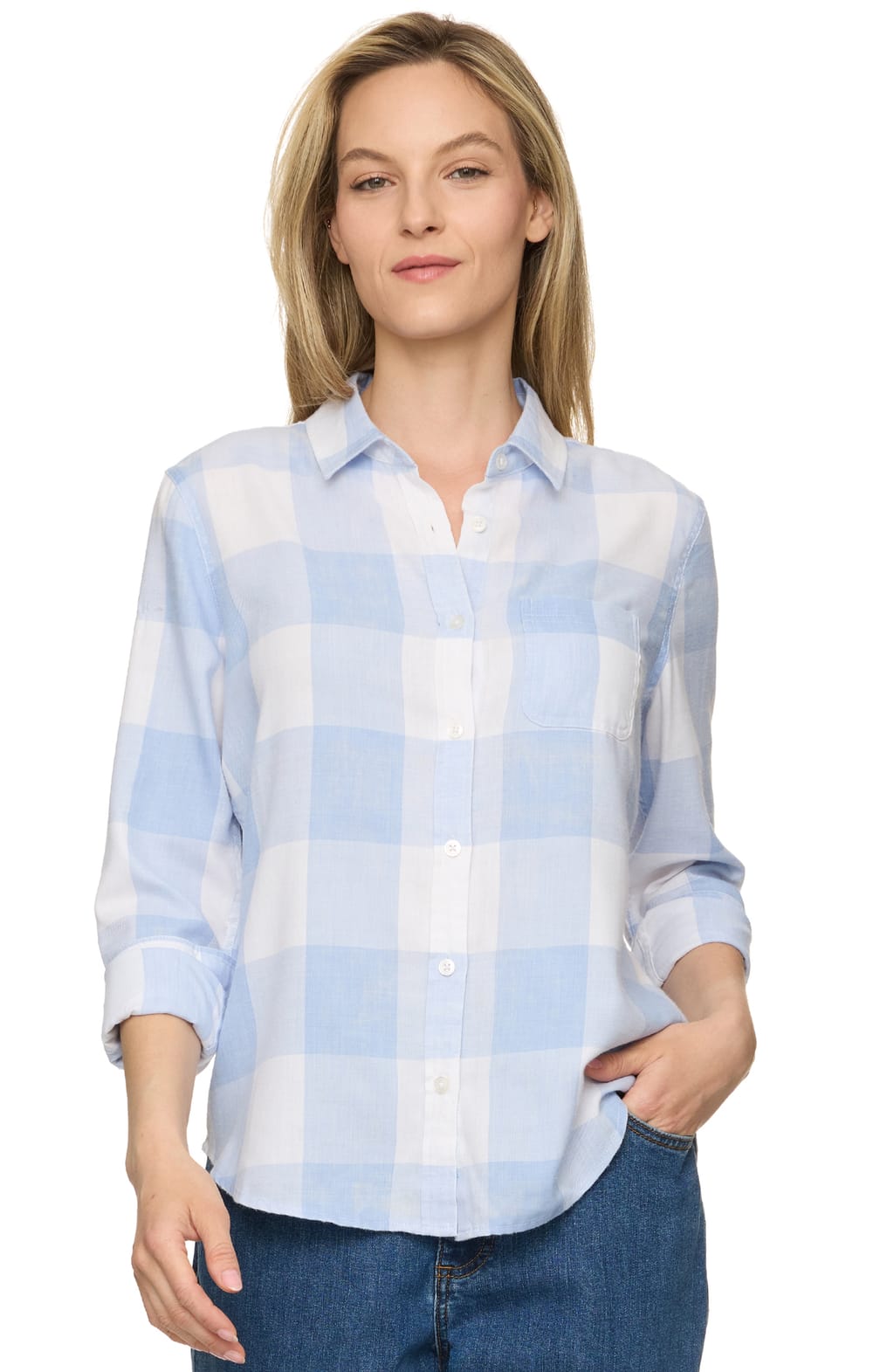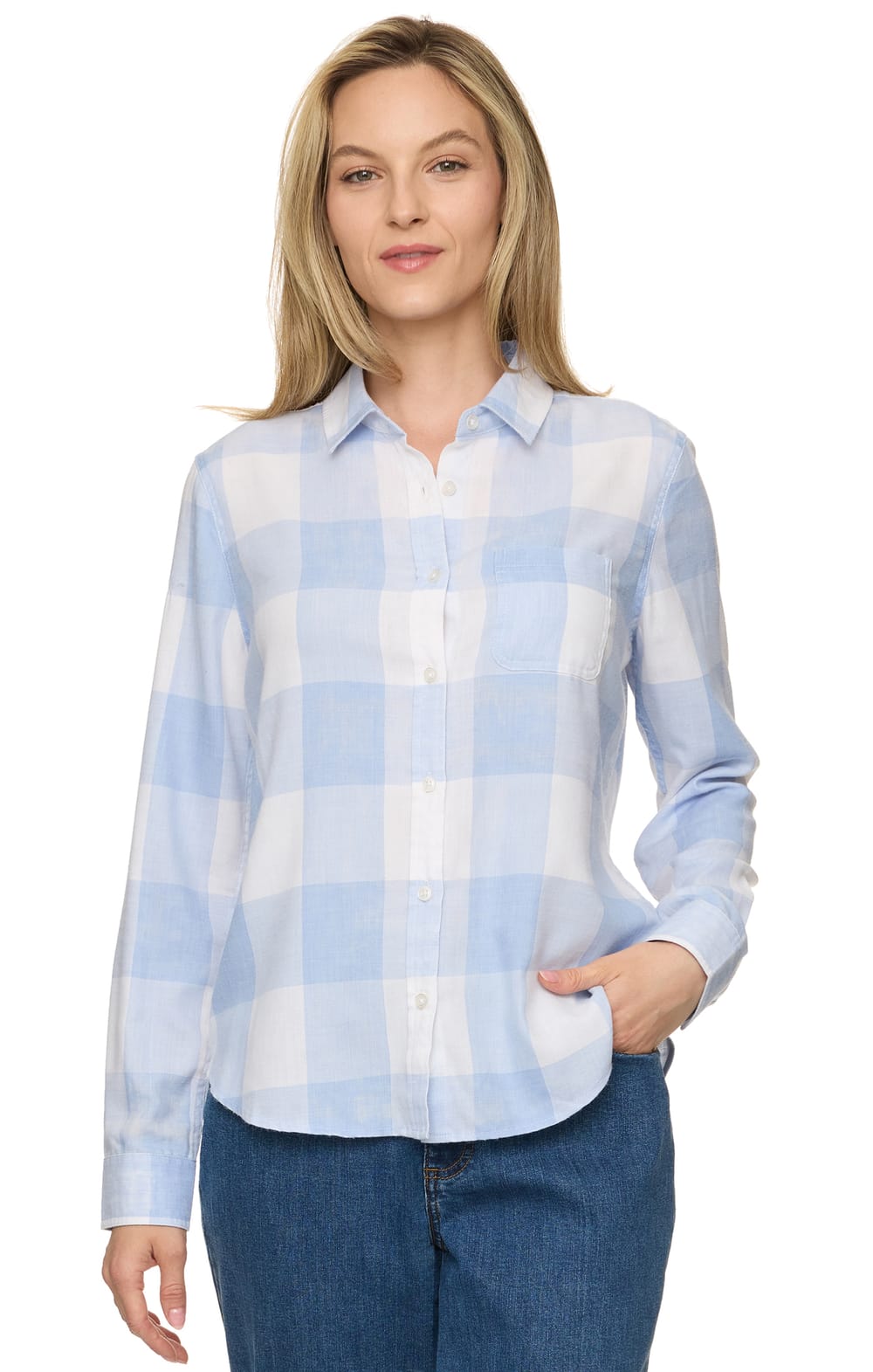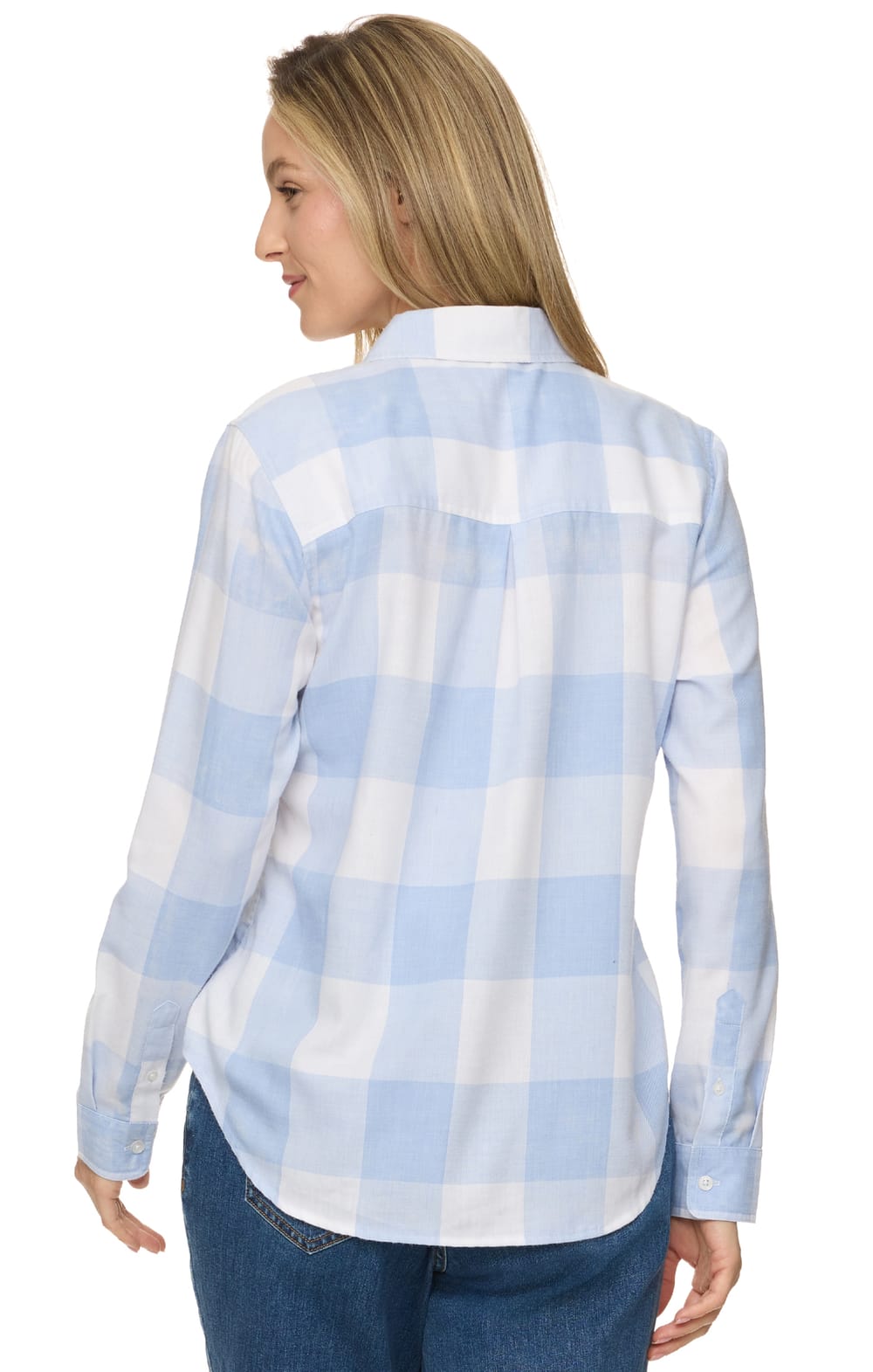 The perfect versatile piece to add to your spring wardrobe. Made from an insanely soft and comfortable cotton blend burnout fabric detailed with a timeless plaid print, this long-sleeve button up shirt offers an authentic, vintage-inspired look that’s impeccably tailored and fit to flatter you. Contrast fabric inside neckband, back yoke, sleeve cuffs, and plackets. Single front chest pocket. Rounded hem.