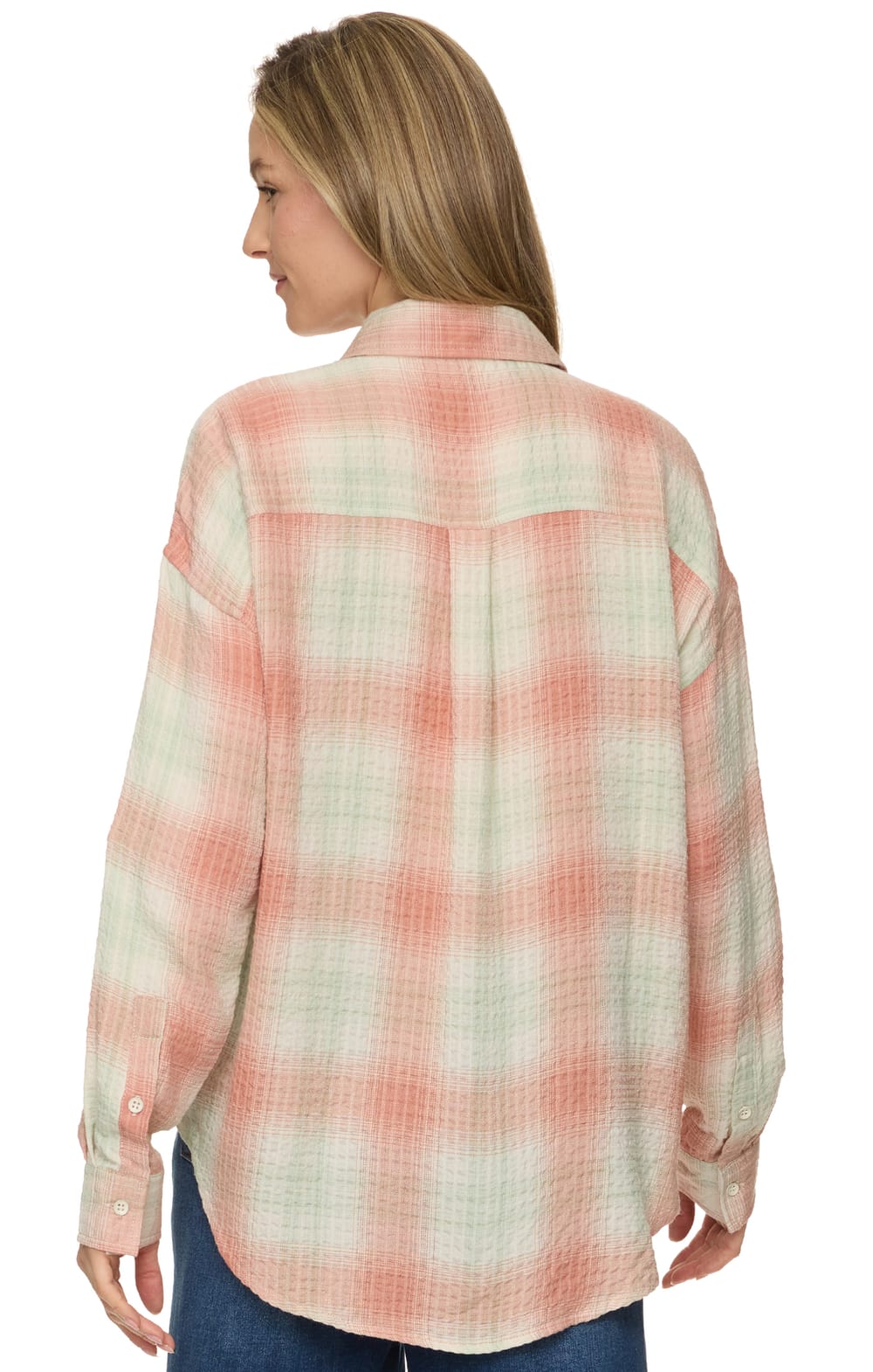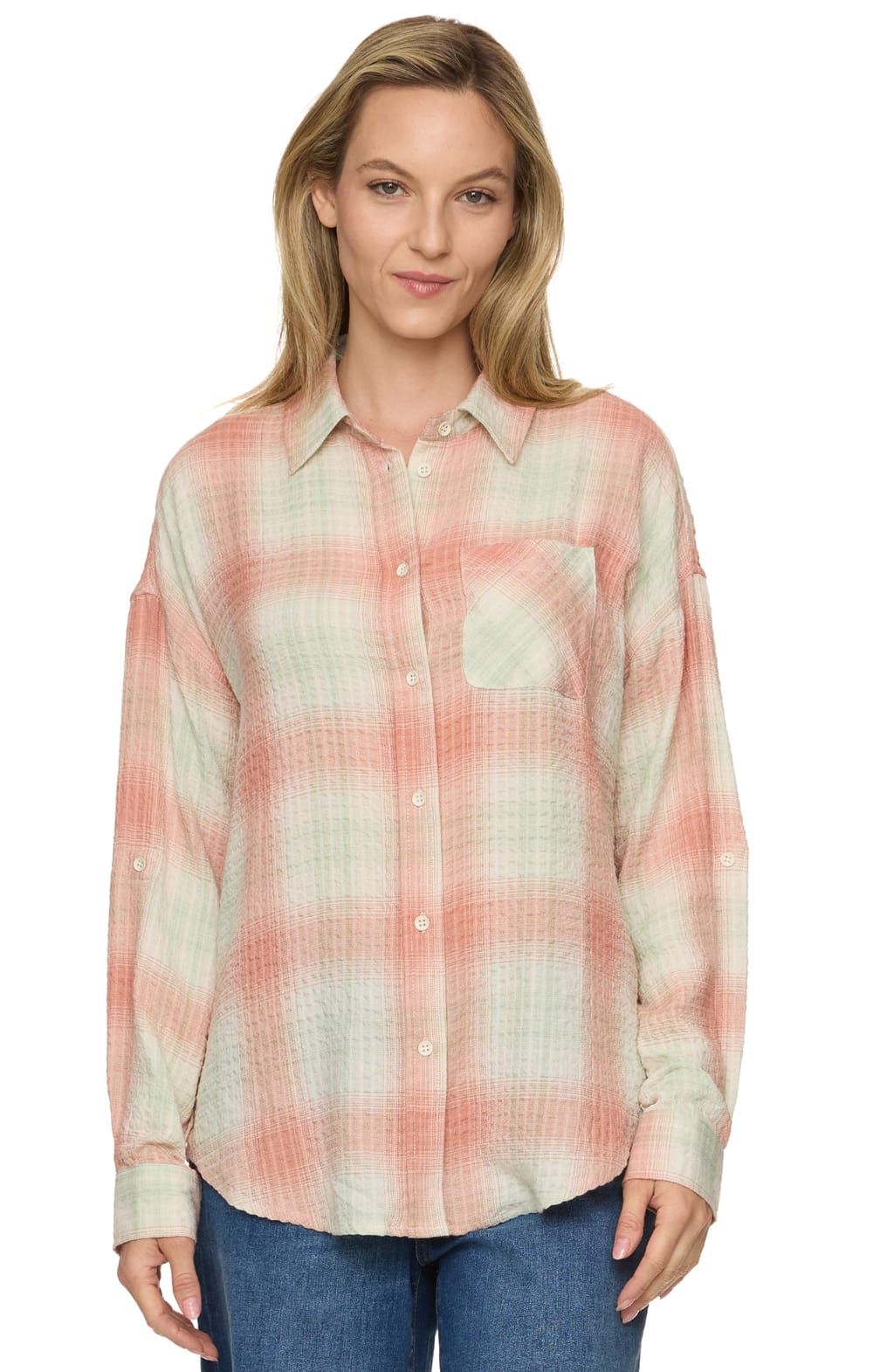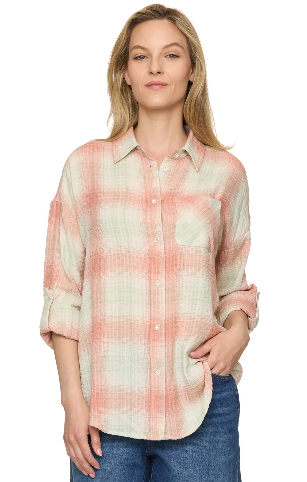 Keep things casual and cute with our Emma Boyfriend Shirt. Lightweight woven puckered fabric boasts a classic plaid design as it shapes long sleeves with button cuffs and a collared neckline. Functional button placket accents the front of the relaxed, slightly oversized body with a convenient patch pocket at front and a subtle high-low rounded hem.