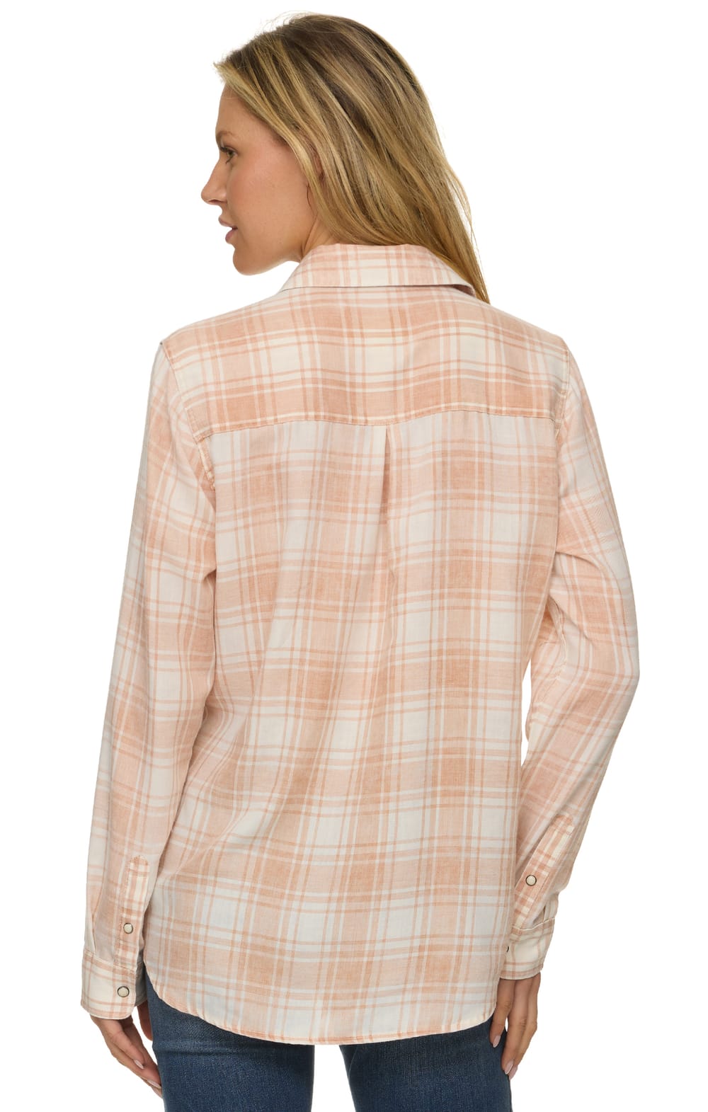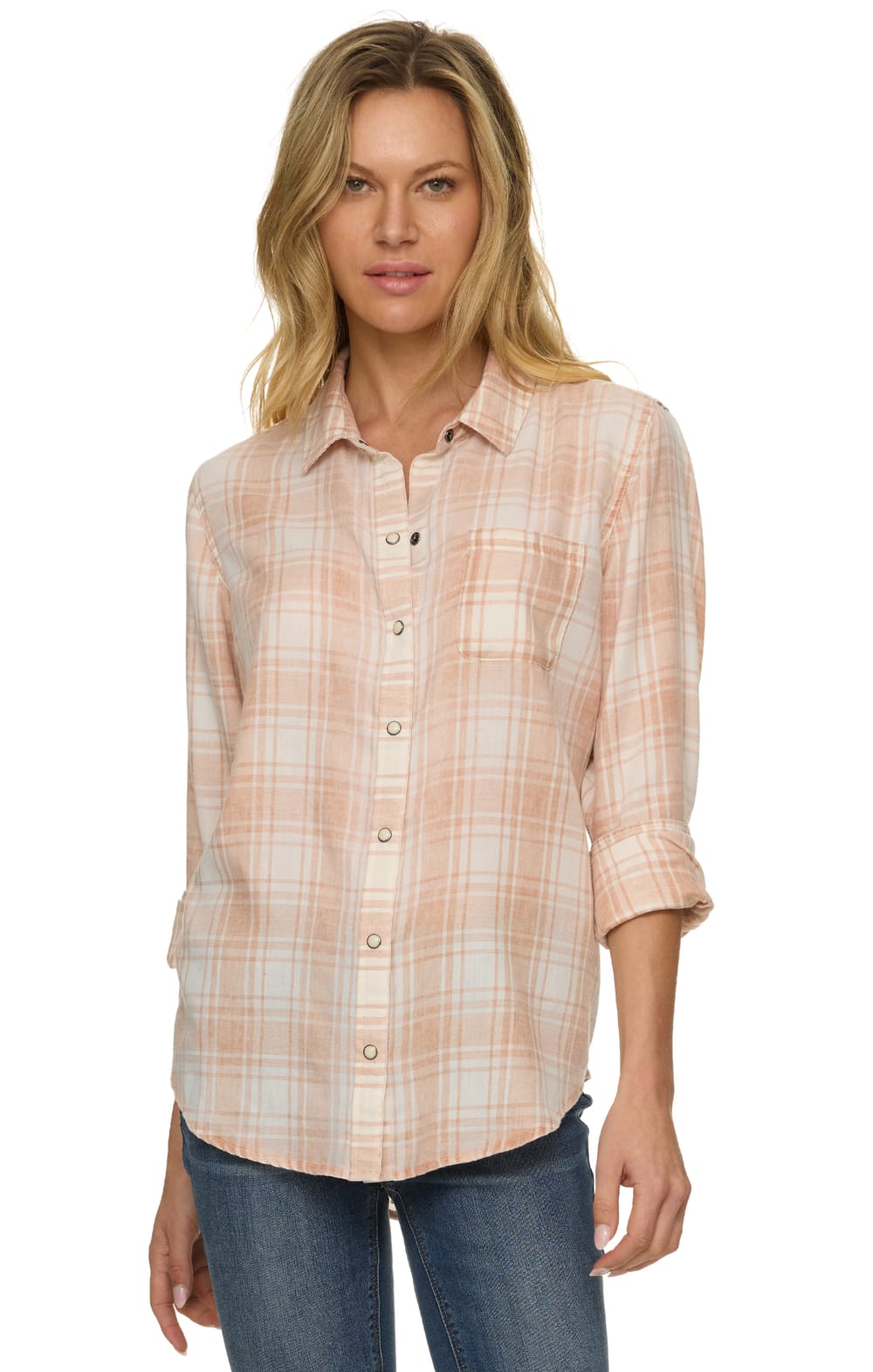 The perfect versatile piece to add to your spring wardrobe. Made from an insanely soft and comfortable cotton blend burnout fabric detailed with a timeless plaid print, this long-sleeve button up shirt offers an authentic, vintage-inspired look that’s impeccably tailored and fit to flatter you. Contrast fabric inside neckband, back yoke, sleeve cuffs, and plackets. Single front chest pocket. Rounded hem.