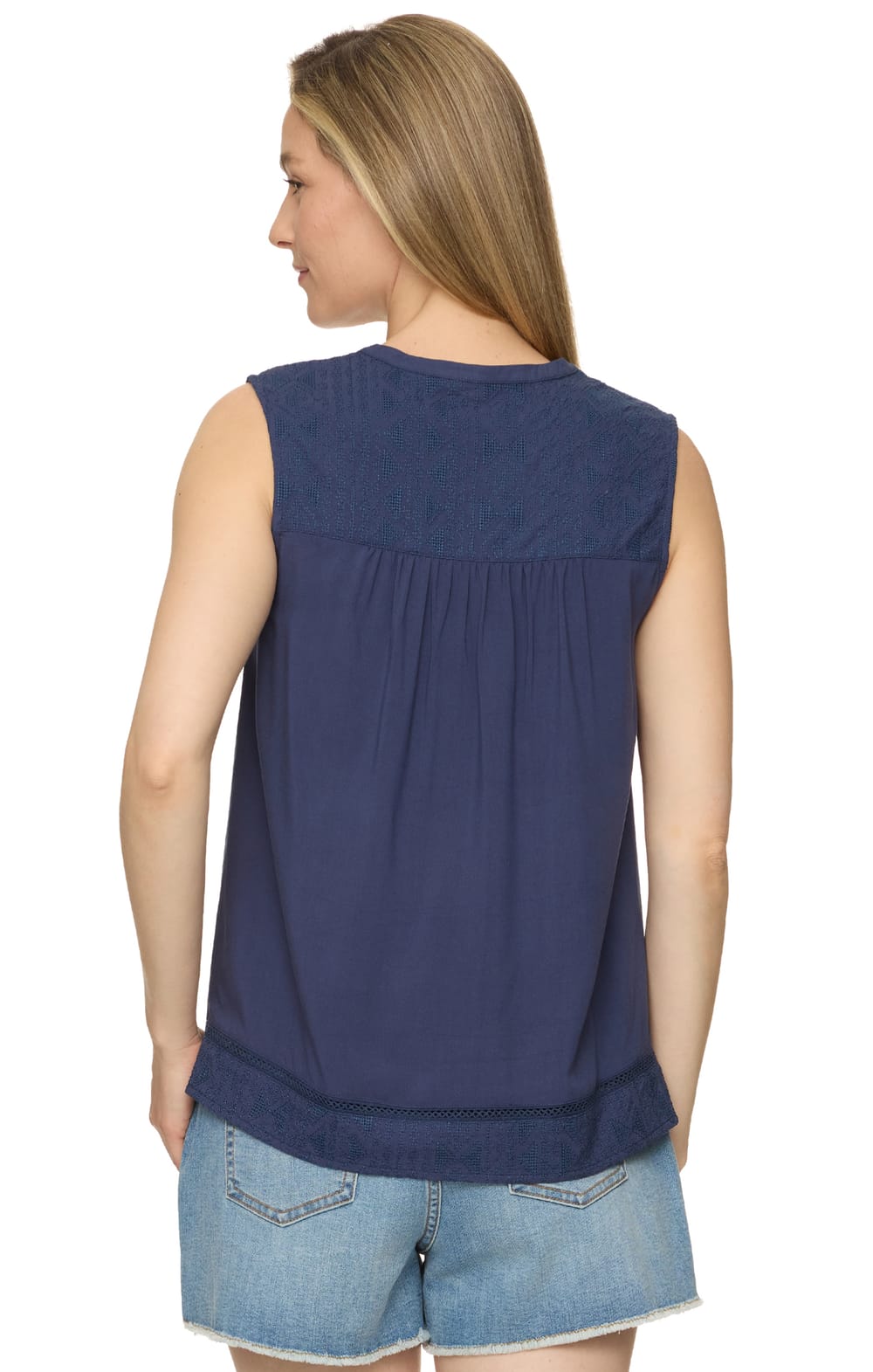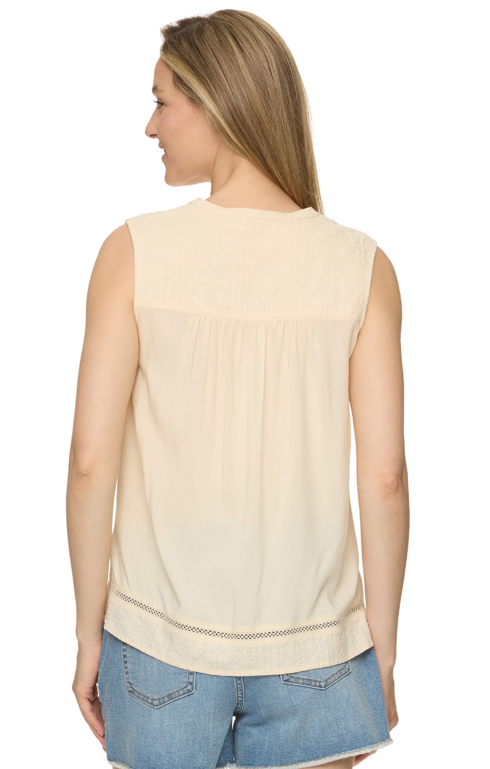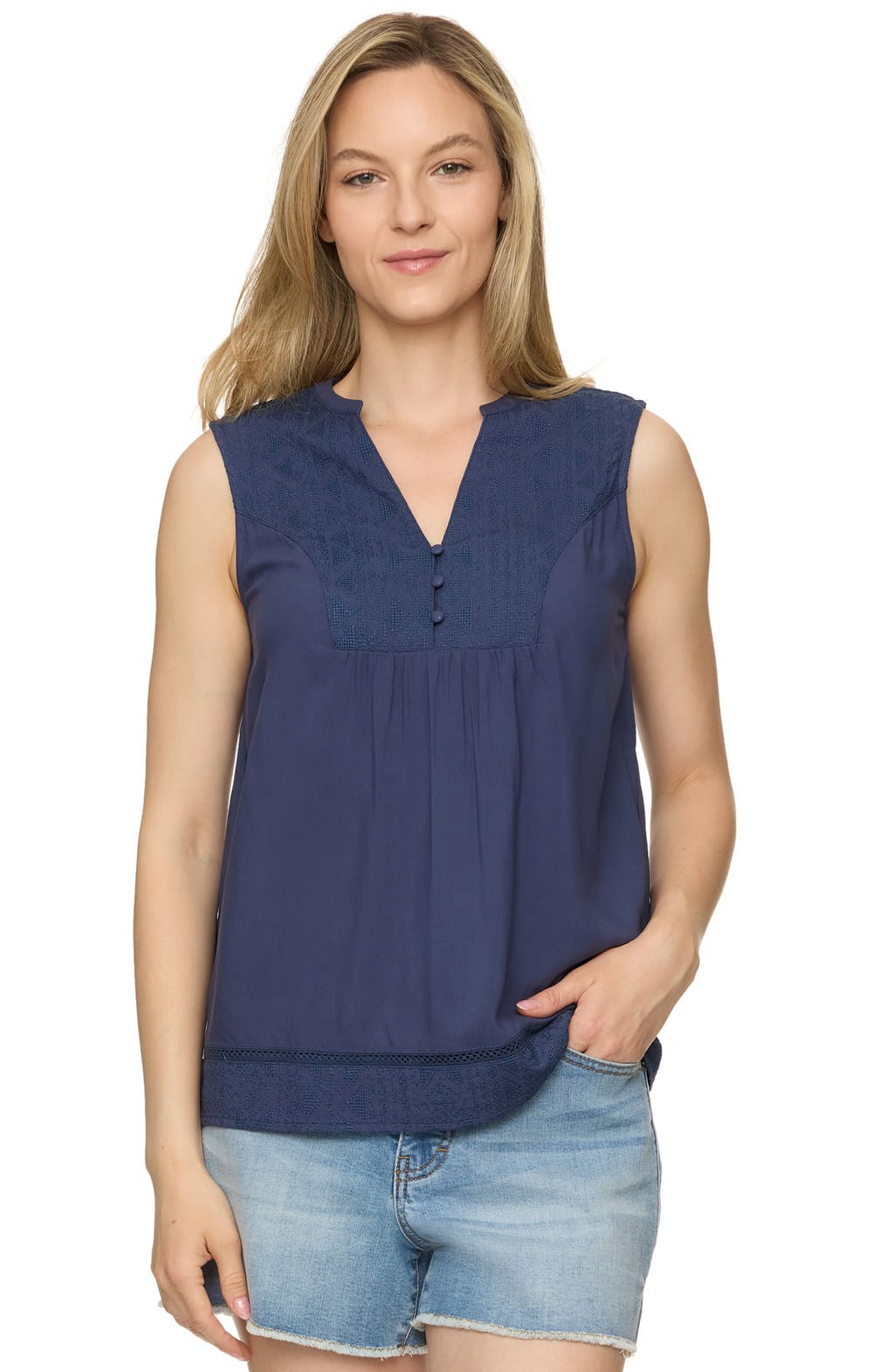 With your favorite jeans and our Jane Top, you’ll have an effortless outfit to keep on repeat. Light and airy woven fabric matched with vintage-inspired embroidered trim adds a touch of prairie trend. This transitional sleeveless top features a split neckline that sits atop a lace embroidered front and back yoke, adding femininity while the casual, relaxed fit flatters every body.