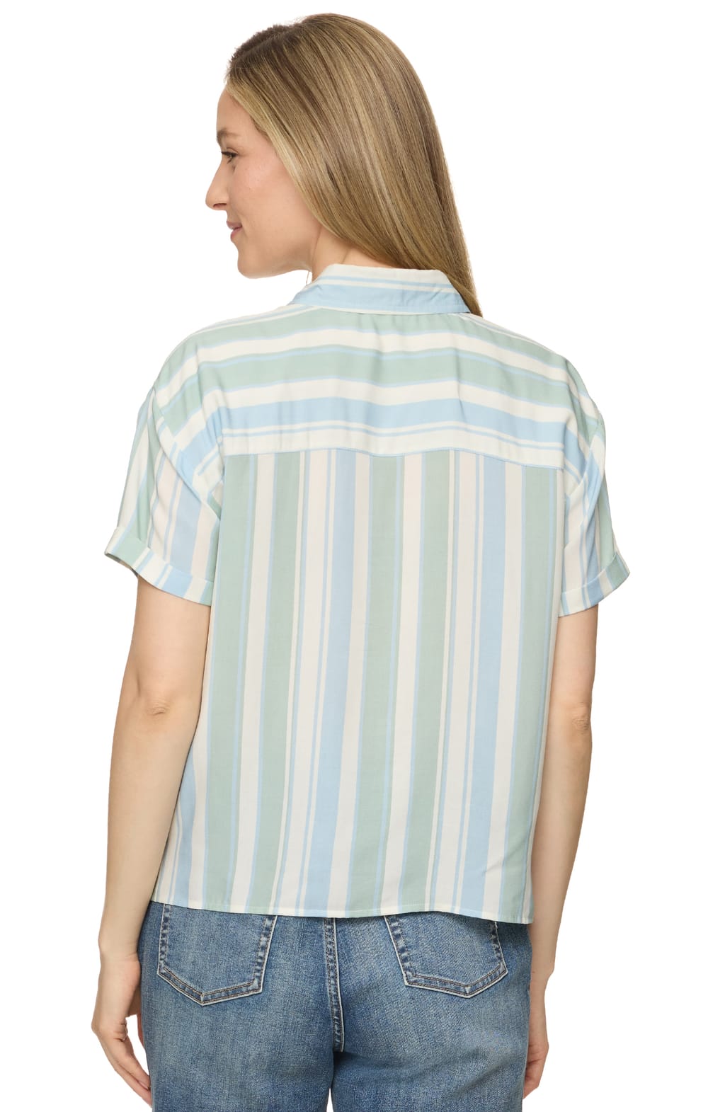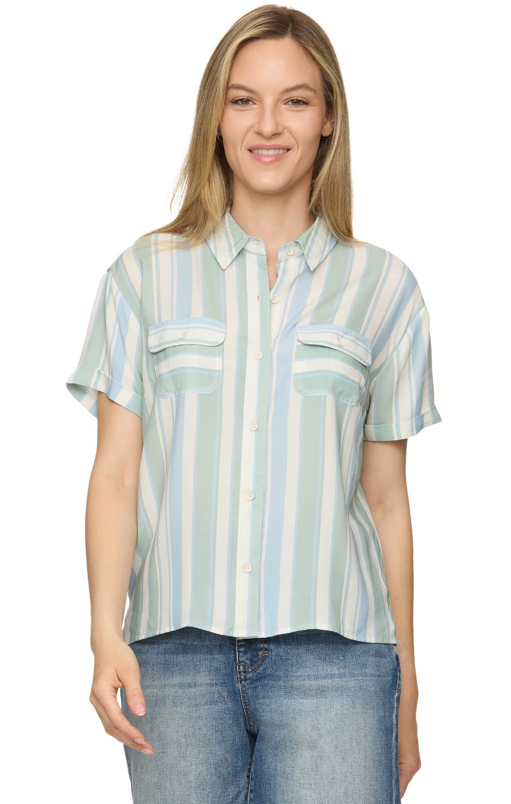 Feel the warm spring breeze in our Nora Shirt. Soft, lightweight fabric shapes this striped button up with cuffed short sleeves that features dual chest flap pockets with button closures and side slits at the bottom hem for a roomier fit.