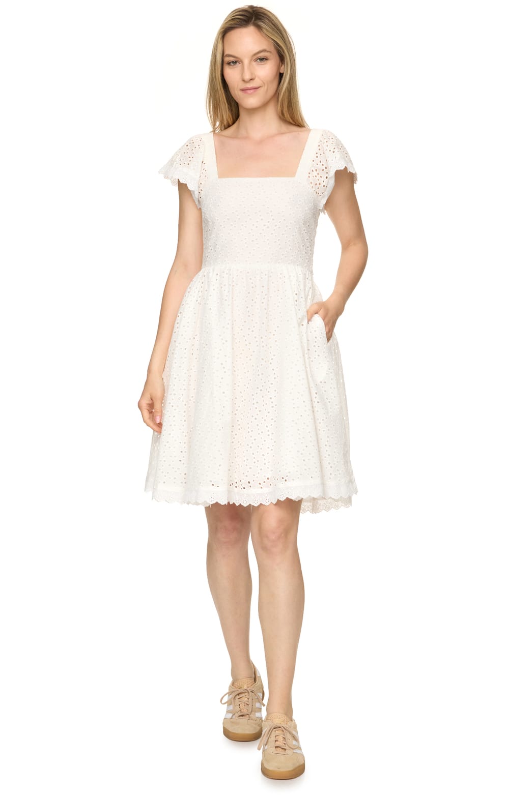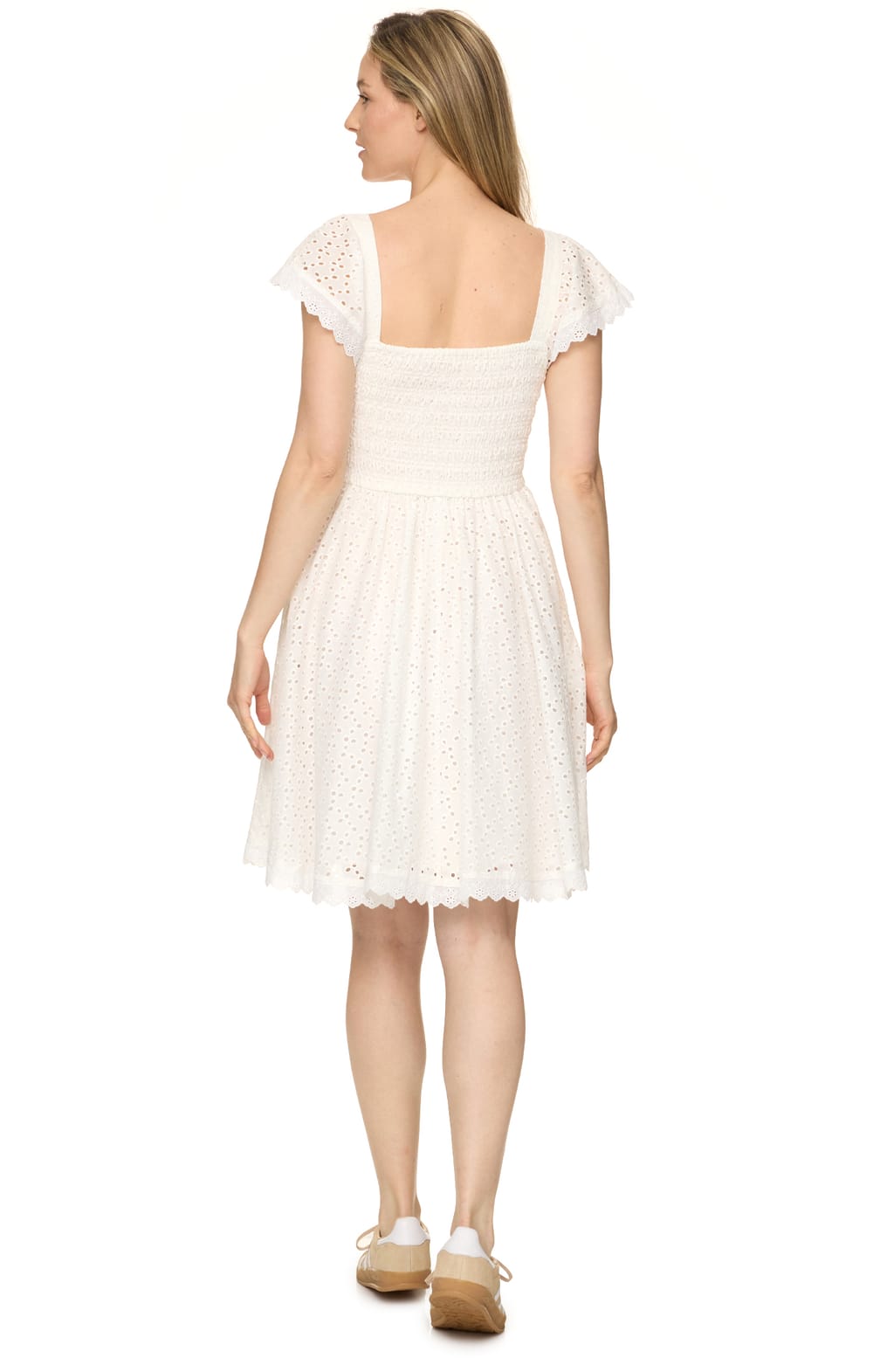 Eye-catching, feminine, and figure-flattering, our Opal Mini Dress will be your go-to all season. Lightweight woven fabric sits under delicate eyelet lace fabric, shaping this square neckline dress, with short flounce sleeves, and a smocked back bodice.