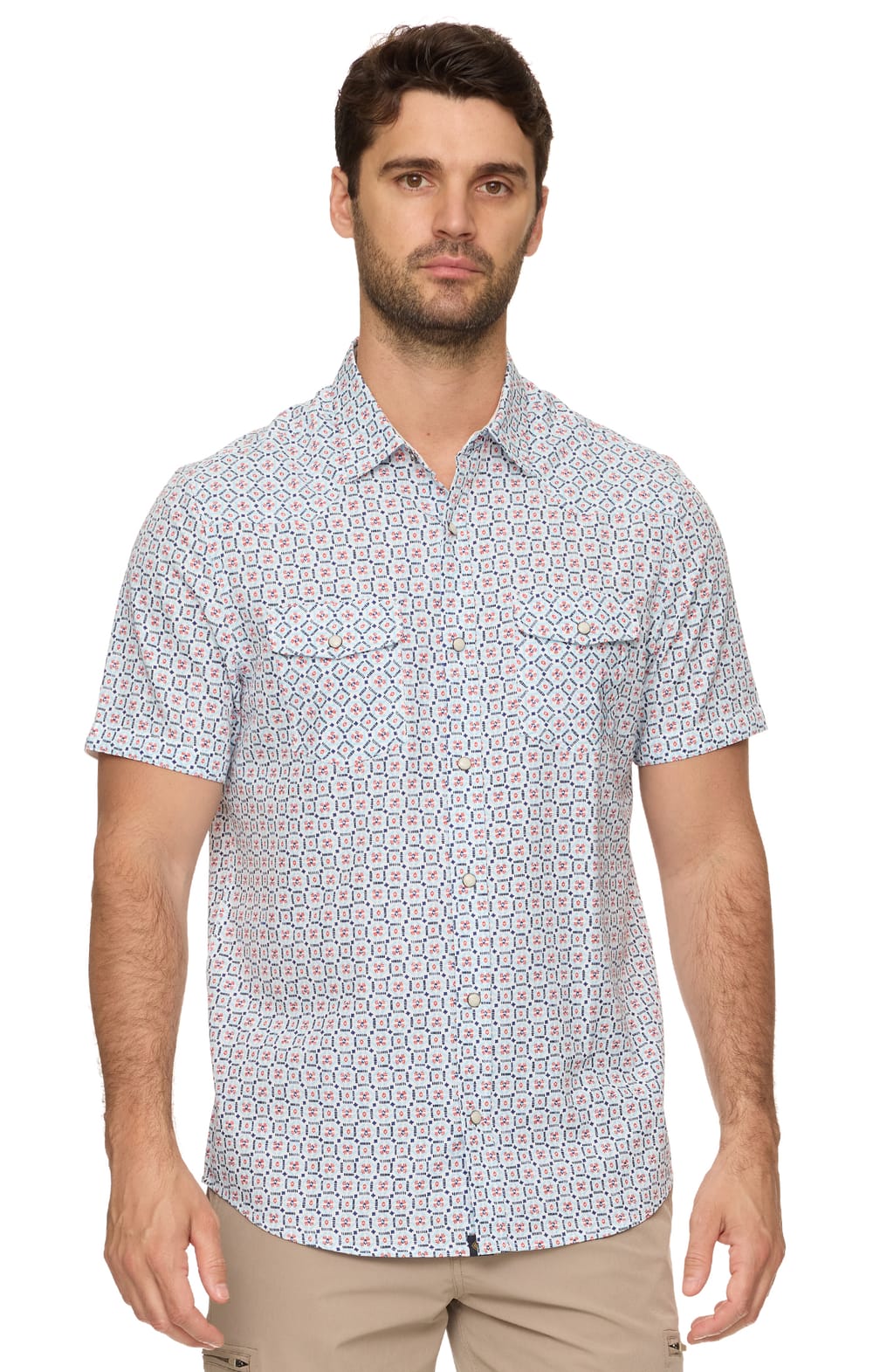 A comfortable snap-front shirt is a year-round favorite, but this one was designed specifically for warm-weather days. Made from a lightweight and breathable stretch performance fabric with western detailing that wicks away moisture and shields you from the sun’s harmful rays, our Roy UPF Performance Western Shirt works hard to keep you cool and comfortable – even on the hottest days. Contrast fabric inside collar stand, back yoke, front placket, and sleeve cuffs. Dual front flap pockets; pearlized snap closures. Hidden lens cleaner at the hem keeps optics clean. Tailored athletic fit. Performance Technologies: Moisture-Wicking; Quick-Drying; UPF Protection