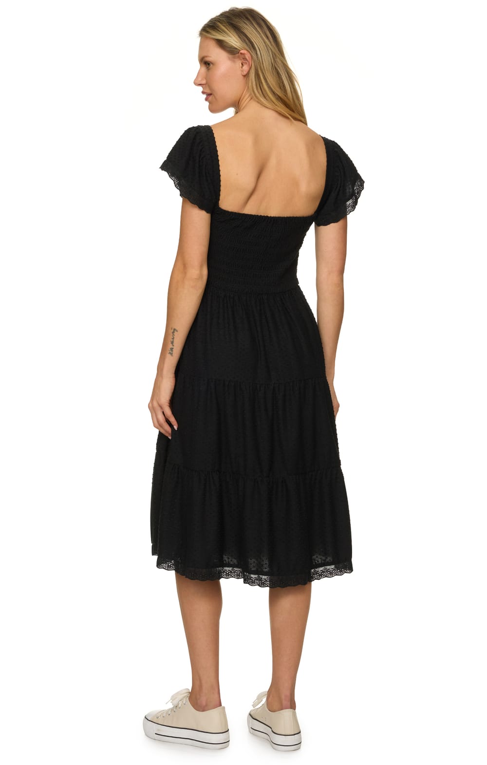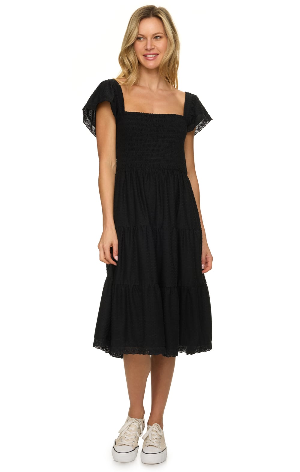 This dreamy spring dress is easy to throw on and wear just about anywhere.This warm weather must have features a front and back smocked bodice that meets the tiered maxi skirt at the waist that falls to a classic midi hem. Flirty eyelet trim accents the sleeves and the bottom skirt hem.